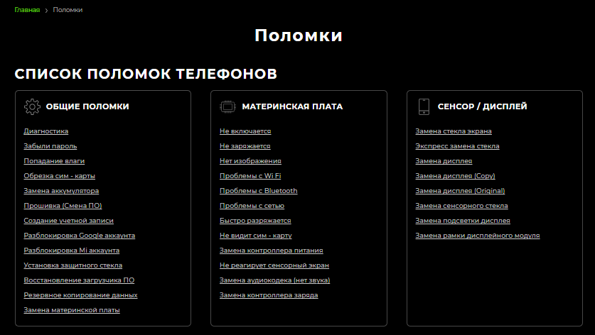 3. Упор на ремонт телефонов в 1-ые месяцы продвижения. Данная ветвь ключевая для клиента, потому было принято решение сделать упор на нее. Также клиент желал отрешиться от странички «поломки», но для SEO-продвижения наличие данной странички оказалось главным, потому мы приняли решение подключить к проекту UX-дизайнера. Опосля анализа спец предложил собственный вариант размещения инфы на страничке. Потому что в проекте участвовали создатели со стороны клиента, все доработки внедрялись в очень сжатые сроки.
