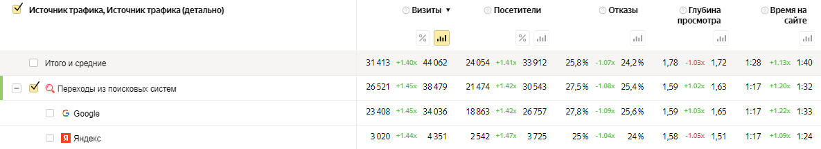 - Google +45% – рост визитов с 23408 до 34 036;