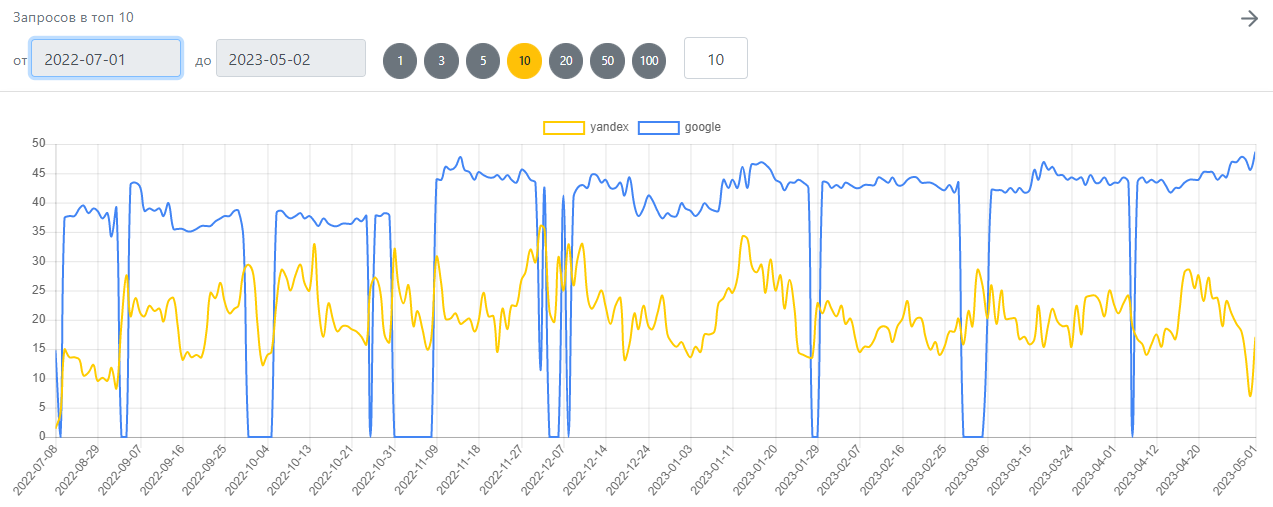 Часть запросов, попавших в топ-10 Yandex и Google: