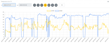 Также нам удалось вывести в ТОП-10 до 49% запросов от всего семантического ядра, которое включает в себя 228 позиций.