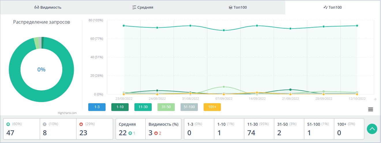 Опосля проведения нужной аналитики и определения семантики для продвижения был проведен контрольный застыл характеристик исследуемых страничек. На момент начала опыта 23 августа 2022 года в топе было лишь 3% запросов – всего 2 ключа. Также сайт имел нехороший уровень SEO-оптимизации, дублированные странички, неуникальный контент и множество иных ошибок.