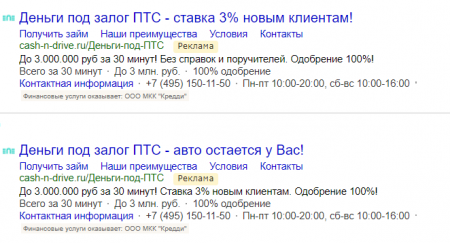 Образцы маркетинговых объявлений, запущенных на поиске по теме «ломбард авто»
