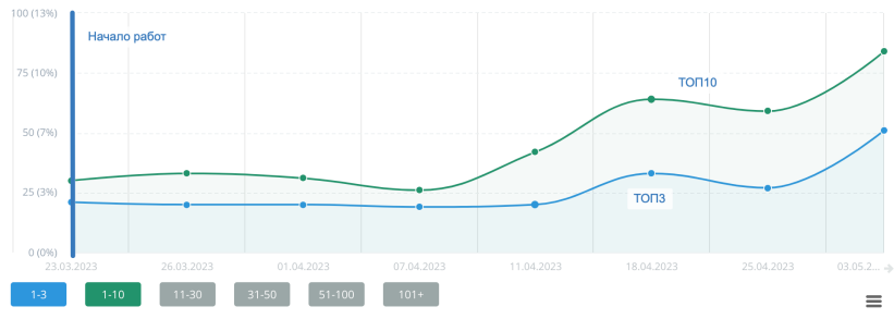 Количество запросов в ТОП-10 Яндекса возросло в 3 раза за 1 месяц и 10 дней (с 23.03. по 03.05.)