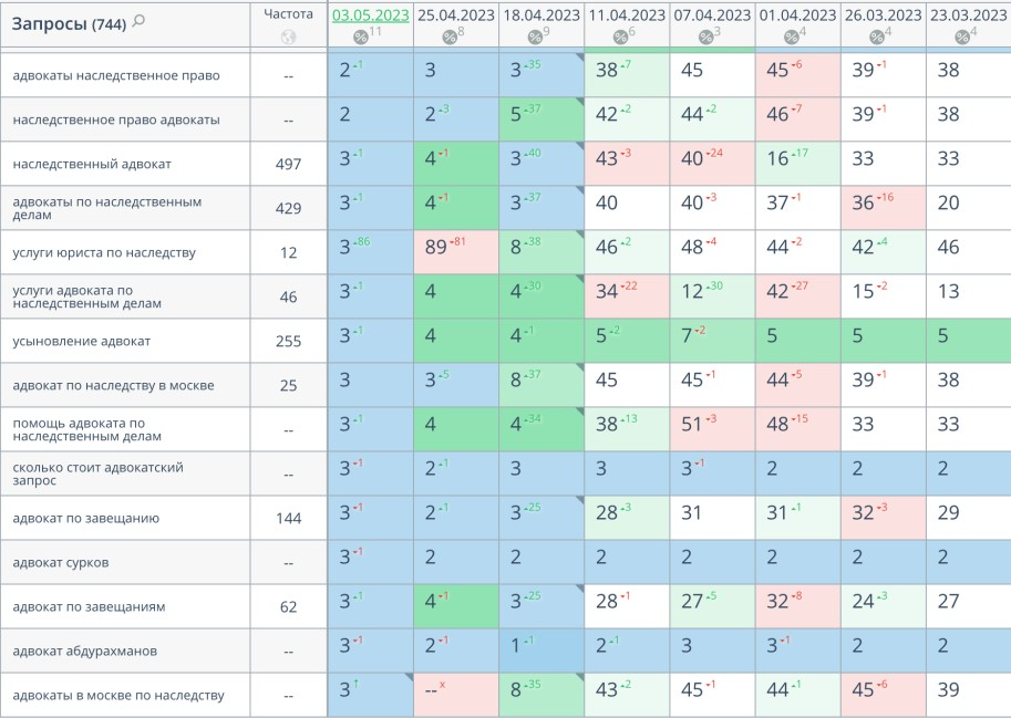Бюро «Щеглов и партнеры» обратилось к нам в марте 2023 года с задачей SEO-продвижения сайта. Основной целью было получение заявок из поисковых систем по конкретным запросам, подходящим услугам компании. Таковым как «адвокат по завещанию», «адвокат по наследству», «адвокат по усыновлению» и иным. Для этого необходимо было вывести сайт по сиим запросам в ТОП.