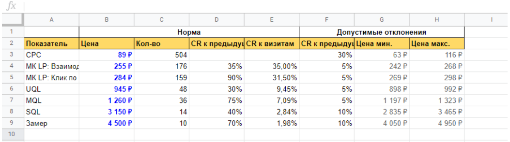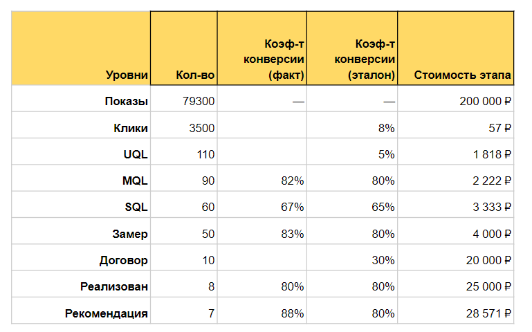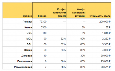 В таблице приведены обычные значения для микроконверсий и шагов воронки, также возможные отличия
