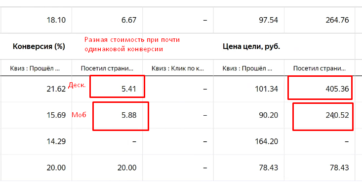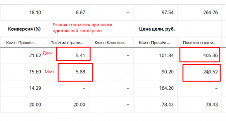 Поглядите на скриншот из Директа: при практически схожей конверсии стоимость заявки с настольных ПК дороже посещений «мобильной аудитории» в 1,8 раза!