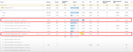 На скрине видно, что эффективнее всего работает кампания «Скинали – Цена»: конверсия 6%, 15 заявок, по 427 рублей за заявку. Самая безуспешная кампания – «Стеновые панели»: конверсия 1%, три заявки, 1 923 рублей за заявку