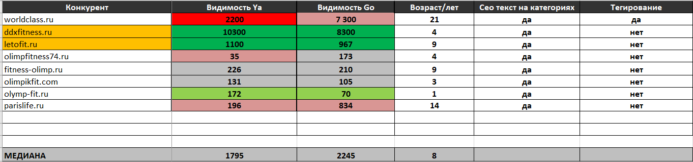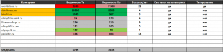 Мы отобрали 8 страничек соперников и проанализировали их видимость в Яндекс и Google, определили возраст страничек, наличие SEO-текстов и тегирования, количество сайтов-доноров и наружных ссылок на ресурсы.