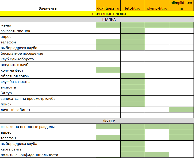 Потом приступили к аудиту коммерческих причин. Для данной цели избрали 4 сайта соперников и проанализировали их на наличие коммерческих причин, другими словами частей на сайте, которые способны воздействовать на решение гостей о покупке. Таковыми коммерческими факторами стали, к примеру, форма обратной связи, клавиша «Заказать звонок», клавиши соцсетей в футере, информация о клубных картах и тренерах.