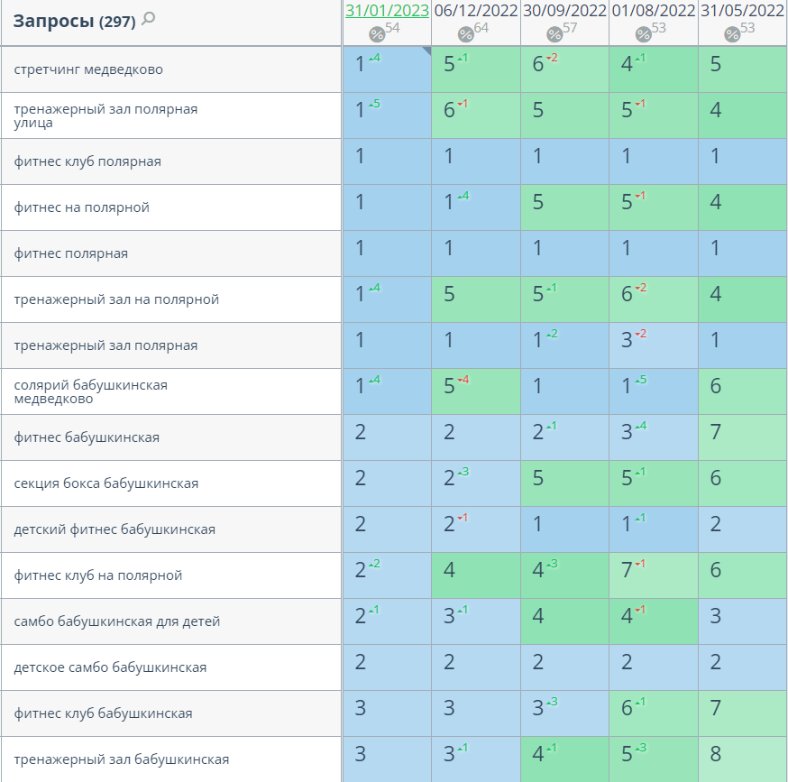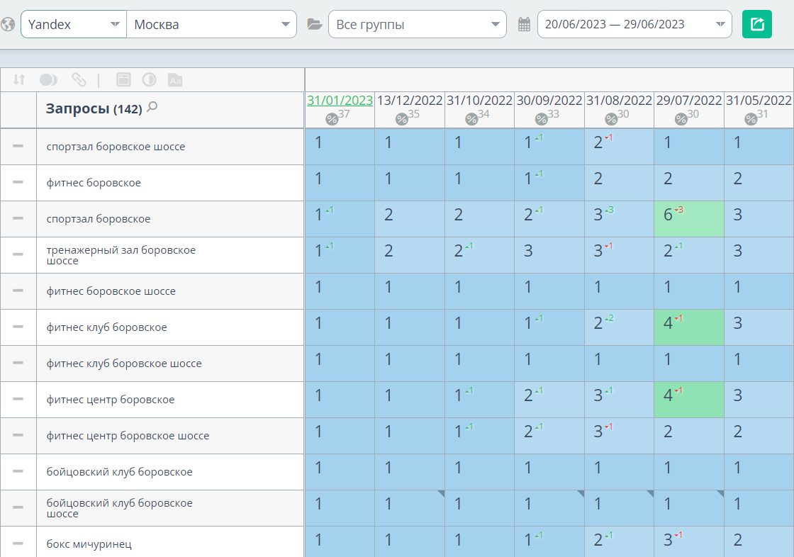 Услуга спорта чрезвычайно зависима от гео, люди избирают себе клуб поначалу по расположению, рядом с домом либо работой. Потому более целевые запросы предполагали охват смежной с клубом местности. Невзирая на то, что у спорт зала всего 2 филиала, было собрано великое количество гео-запросов, потому что около клубов находится много районов и станций метро. К примеру, близко от Боровского шоссе находятся районы Солнцево и Новопеределкино, и мы прибавляли наименования этих локаций в запросы.