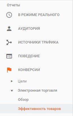 Рис. 1. Отчет по эффективности продуктов в блоке «Электронная торговля», Google Analytics