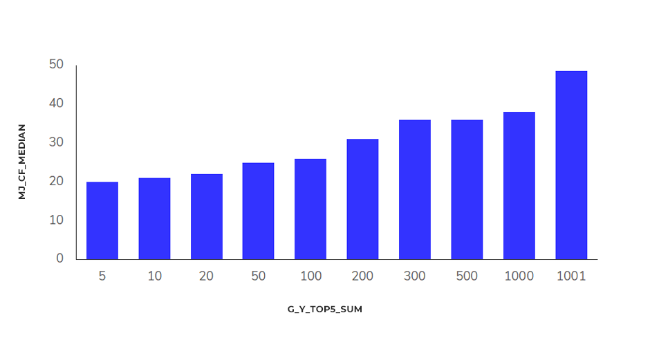 G_y_top5_sum – группы по количеству запросов в топ-5 по Яндексу, где 5 – 5 и наименее, 10 – от 5 до 10, 20 – от 10 до 20 и так дальше. 1001 – наиболее 1000 запросов в топ-5.
