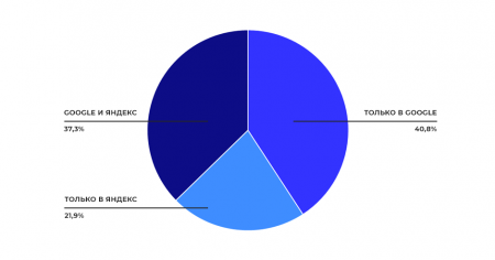 Сейчас поглядим на распределение числа доменов, которые по анализируемому СЯ ранжируются лишь в Яндексе, лишь в Google либо в обеих ПС.