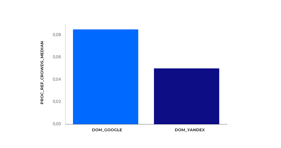 А вот тут видна явная разница. Для Google процент crowd-ссылок практически в 2 раза выше – 9% против 5%.