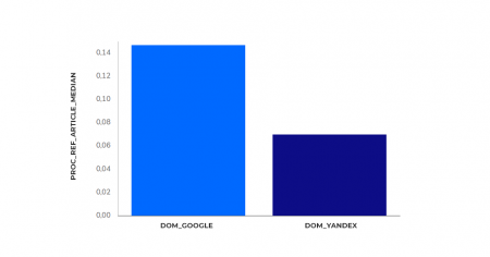 Тут также видна разница: 15% для Google и 7% для Яндекса. Google очевидно больше оценивает статейные ссылки.