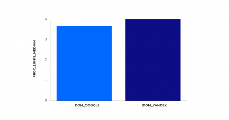 Тут также нет заметной различия в предпочтениях различных поисковых систем. Для обоих частей среднее число ссылок с домена недалеко к 4.