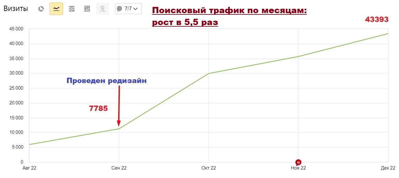 Как мы видим, дневной трафик возрос в 3 раза – с 600 до 1750 гостей в день. А ежели глядеть по месяцам, то рост трафика с сентября по декабрь 2022 составил более чем 5 разов (с 7785 до 43393 неповторимых гостей за месяц) .