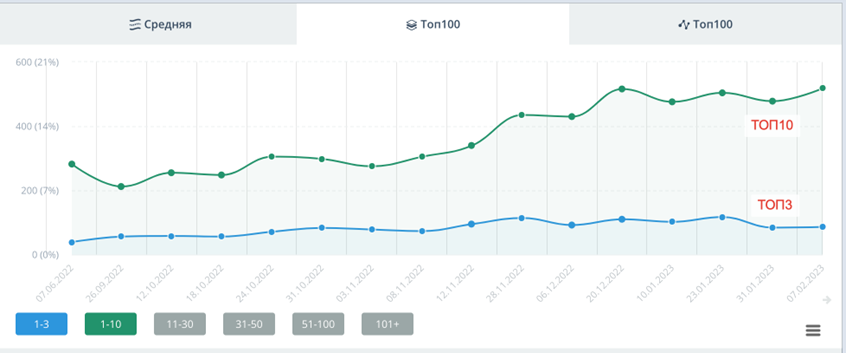 Также сайт попал в ТОП-10 по почти всем частотным запросам в нише в интересующих клиента регионах.