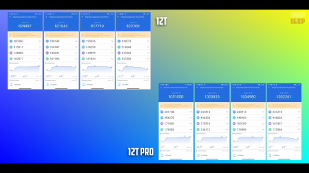 Далее - о «железе». На Xiaomi 12T Pro установлен процессор Snapdragon 8+ Gen 1 (8/12 ГБ ОЗУ и 128/256 ГБ постоянной памяти), на 12T - Dimensity 8100 Ultra (8 ГБ ОЗУ и 128/256 ГБ постоянной памяти). Pro-версия имеет некоторое преимущество перед 12T. С результатами тестирования процессоров вы можете ознакомиться ниже.