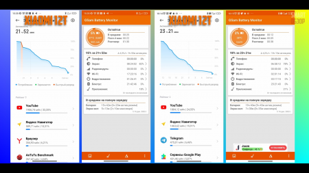 Заряжаются оба смартфона быстро, но 12T Pro оказывается чуть шустрее. При ускоренной зарядке батарея нагревается до 45 градусов. До 100% в этом случае можно зарядить за 19 минут, в режиме без ускорения - за 25 минут. Что касается 12T, то с ускорением он полностью заряжается за 23 минуты, без ускорения - за 33 минуты.