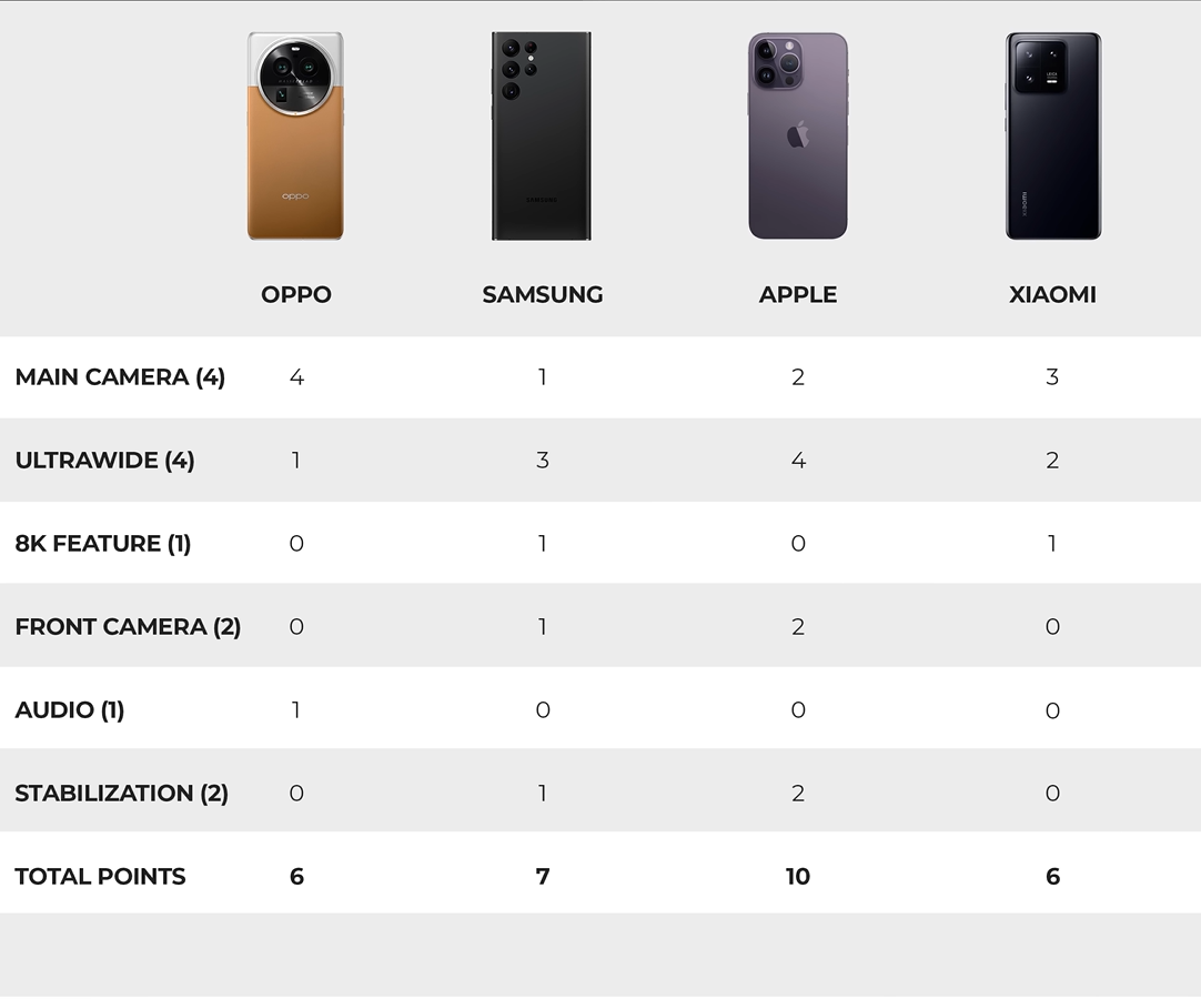 По итогам всех экспериментов больше всего баллов за съёмку видео получил iPhone 14 Pro. На втором месте с 7 баллами идёт Samsung S23 Ultra, а Xiaomi 13 Pro и Oppo Find X6 Pro получили оба по 6 баллов.