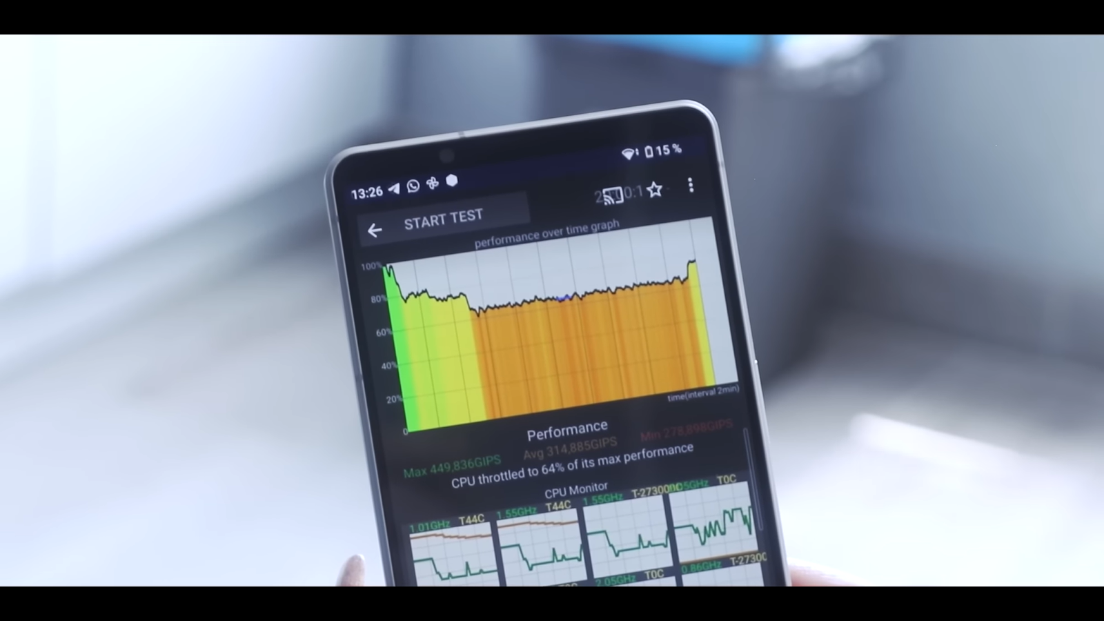 В AnTuTu смартфон набирает более 1 миллиона баллов. Но он при этом ужасно проходит троттлинг-тест, особенно под палящим солнцем (см. результаты ниже). В Genshin Impact вы сможете играть с 45-50 к/с, и в целом вам будет комфортно.