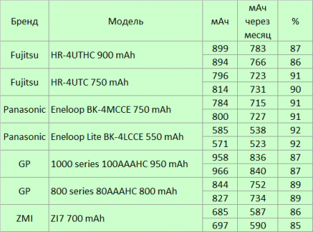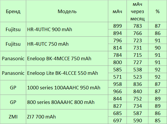 С аккумуляторами ААА ситуация была примерно такая же. Потери ёмкости в целом составили от 8 до 15%. Максимальные потери наблюдались у Xiaomi ZMI ZI7 700 mAh.