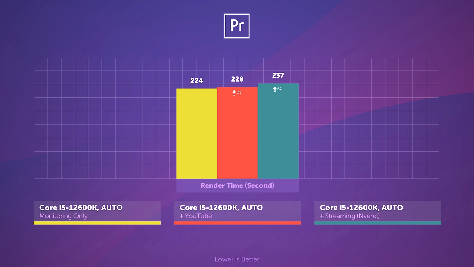 Сначала - о рабочих приложениях. Если говорить о сборке на базе i5-12600K, то в Cinebench R23 ухудшилась при запуске фоновых программ больше всего однопоточная производительность: на 3 и 9 процентов соответственно. Та же самая ситуация наблюдается в Geekbench: в однопоточном режиме быстродействие снизилось на 1 и 8 процентов. Кроме того, из-за стриминга ухудшились результаты в многопоточном режиме уже на 4 процента (из-за YouTube в этом же режиме - только на 1 процент). Что касается Adobe Premiere Pro, то с YouTube работа с ним занимала на 2 процента больше времени, а со стримингом - на 6 процентов больше.