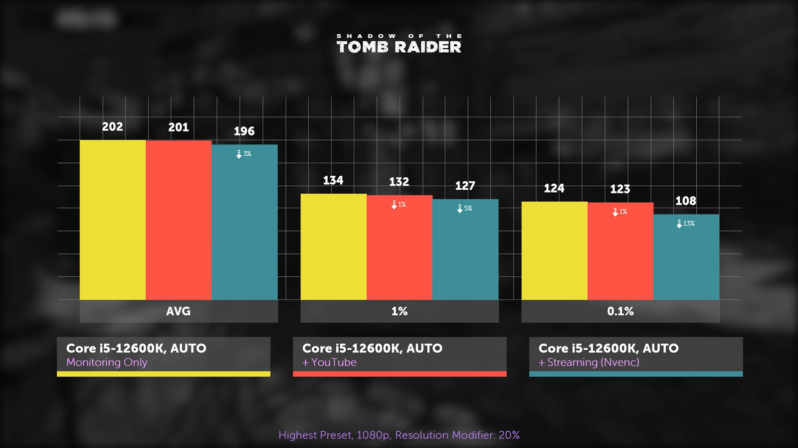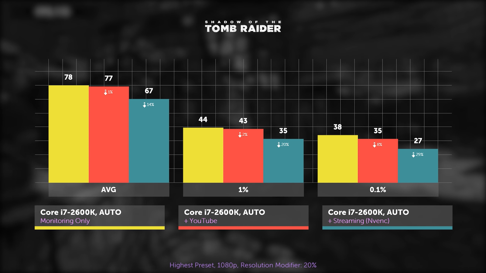 В Shadow of the Tomb Raider снижение среднего FPS составило 1 процент - с YouTube, 14 процентов - со стримингом (78 к/с против 77 к/с и 67 к/с соответственно). В крайне редких событиях этот показатель опустился на 8 и 29 процентов соответственно: 35 к/с и 27 к/с против 38 к/с.