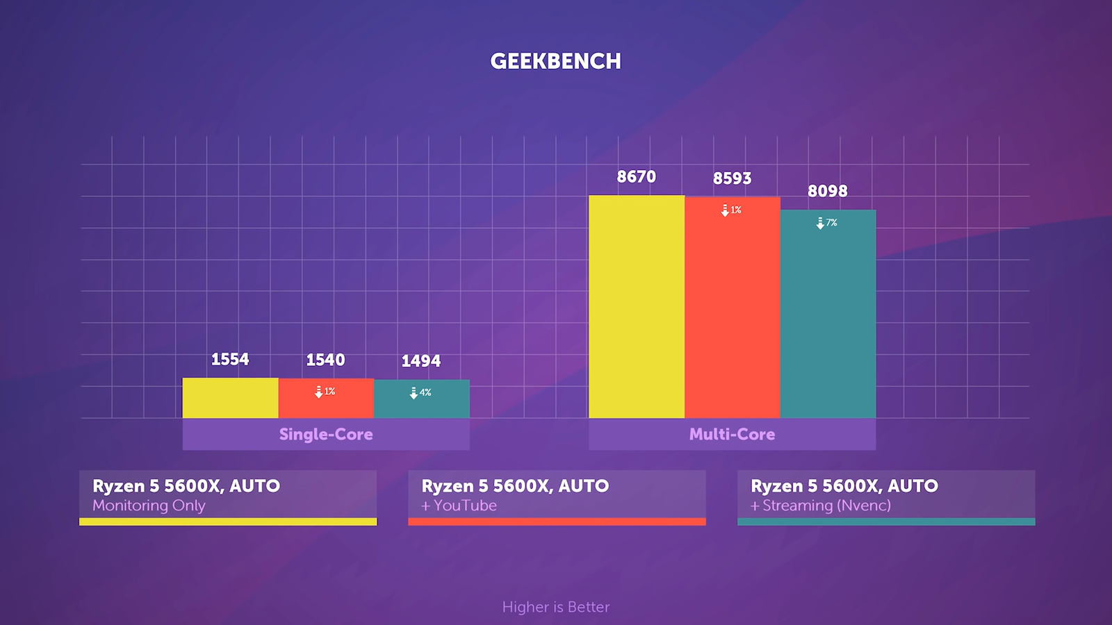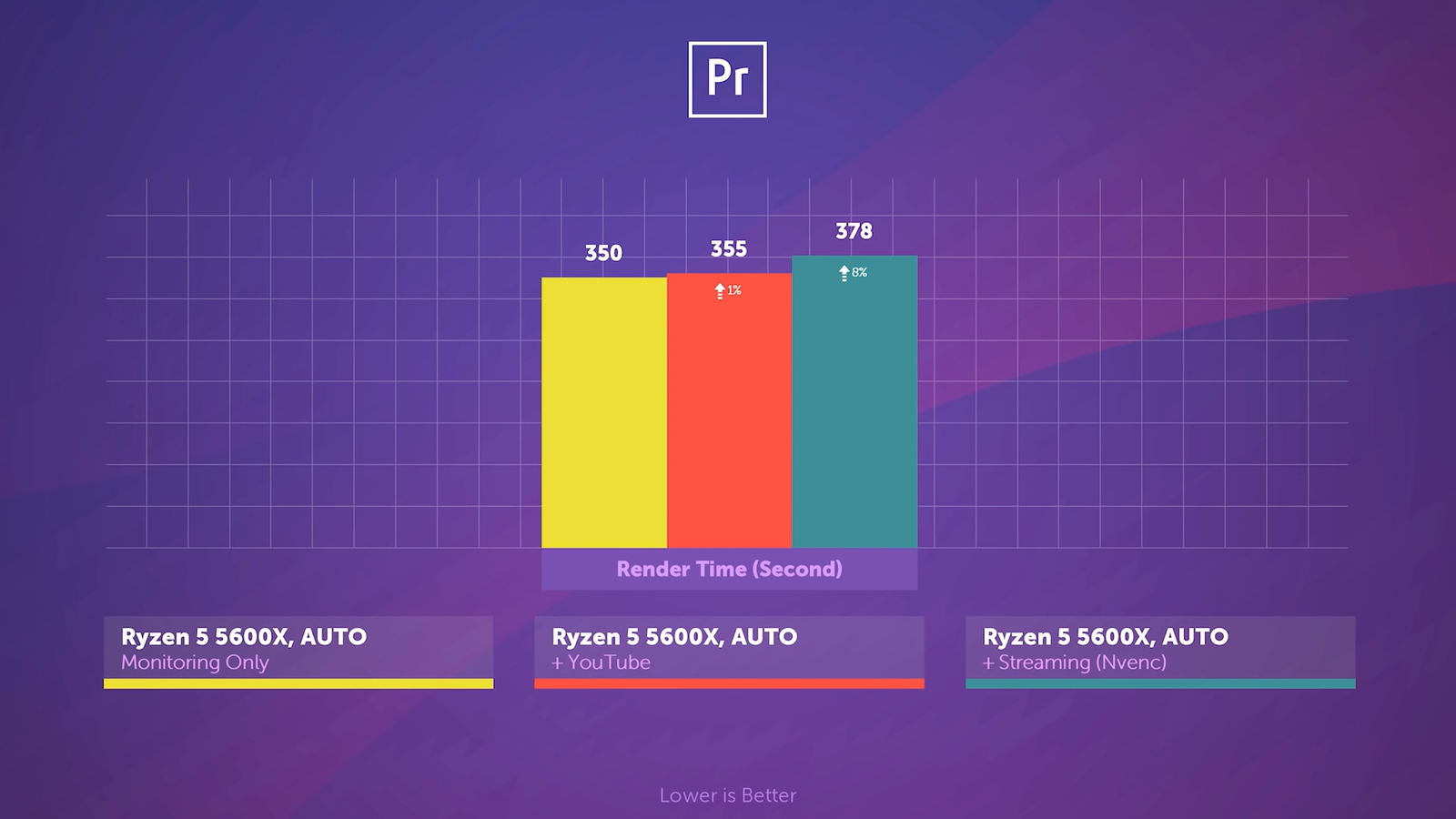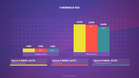 Далее пришла очередь процессора R5 5600X. У этой конфигурации противоположная ситуация в рабочих программах. Больше всего в Cinebench R23 пострадала производительность во многоядерном режиме: с YouTube она снизилась на 1 процент, а вот со стримингом - на 8 процентов. В Geekbench получилось то же самое: во многоядерном режиме она опустилась на 1 и 7 процентов соответственно. Adobe Premiere Pro стал работать ещё дольше: с YouTube - на 1 процент, со стримингом и открытым браузером - на 8 процентов.