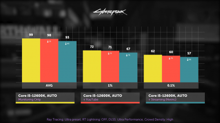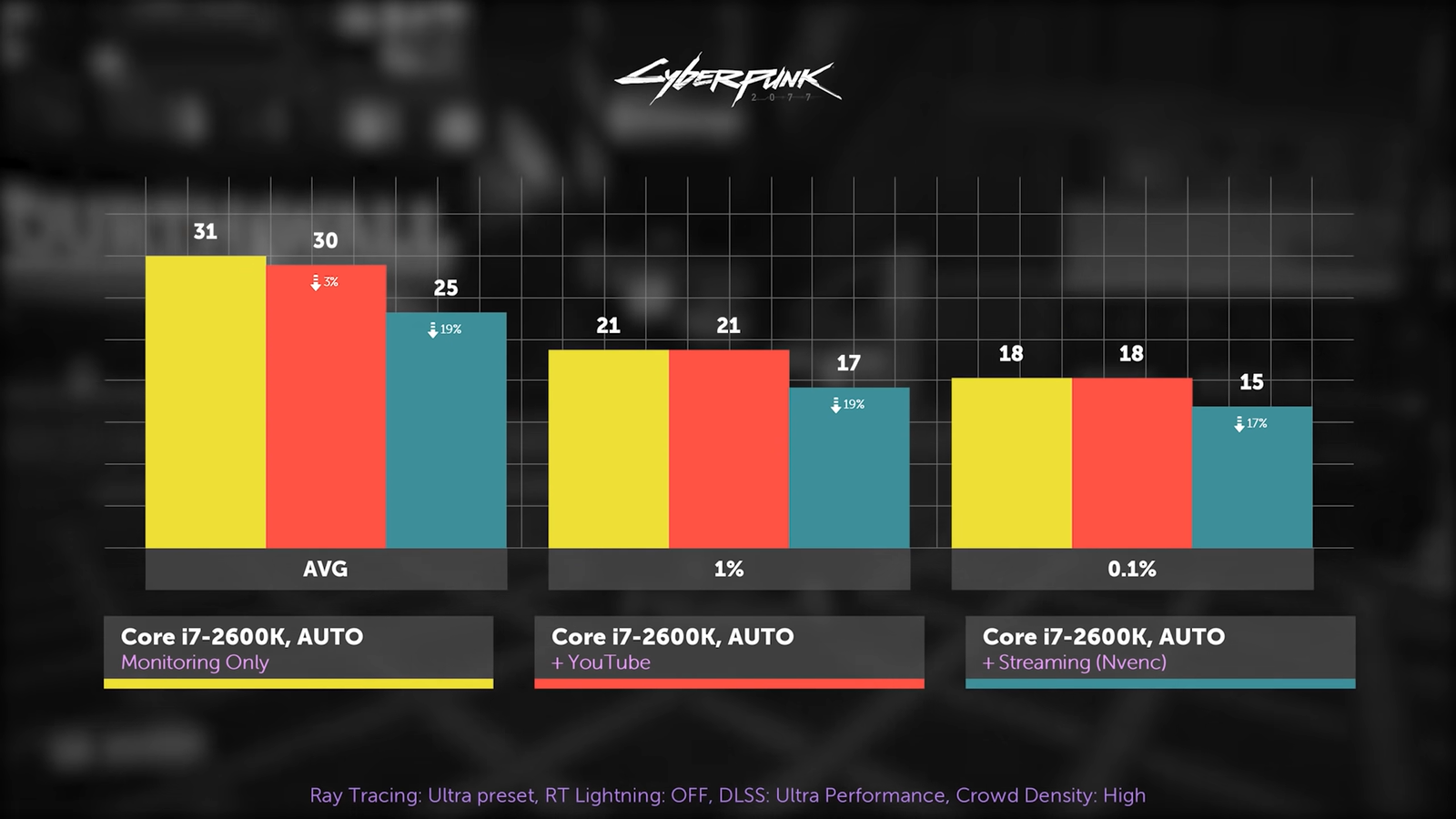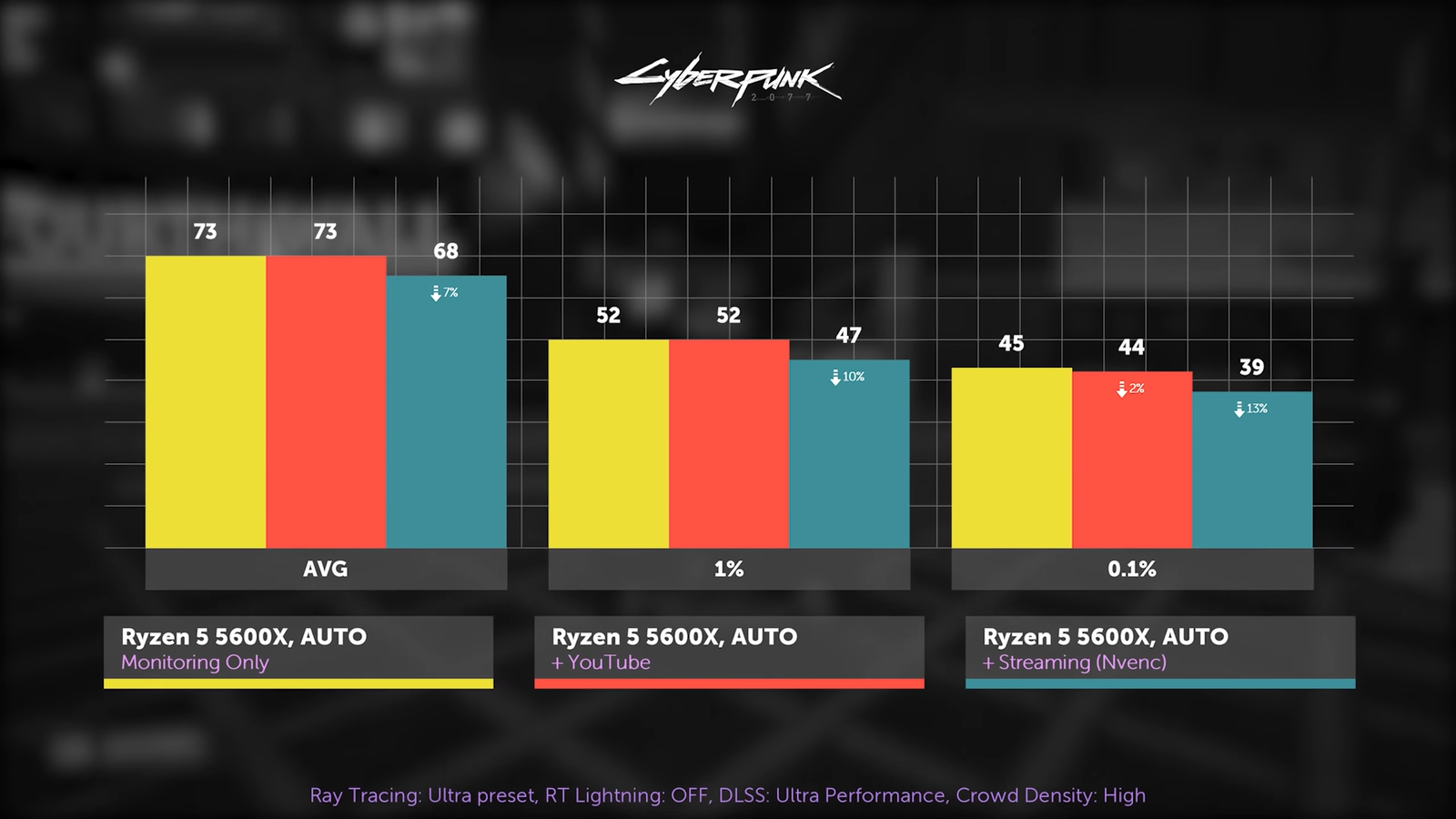 С ультра-пресетом в Cyberpunk 2077 потеря средней производительности составила с YouTube - 3 процента, со стримингом - 19 процентов: 31 к/с против 30 к/с и 25 к/с соответственно. В очень редких событиях значение снизилось только со стримингом - на 17 процентов (15 к/с против 18 к/с).