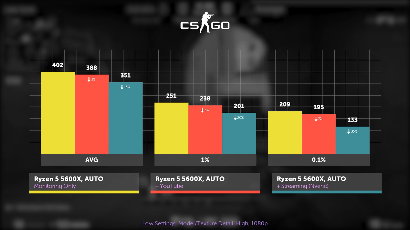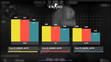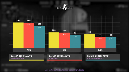 В CS:GO похожая ситуация. Производительность снизилась в среднем c YouTube - на 1 процент, со стримингом - на 14 процентов (160 к/с и 139 к/с против 162 к/с), с очень редких событиях - на 18 и 22 процента соответственно (88 к/с против 72 к/с и 69 к/с).