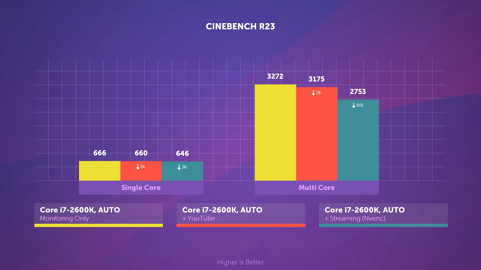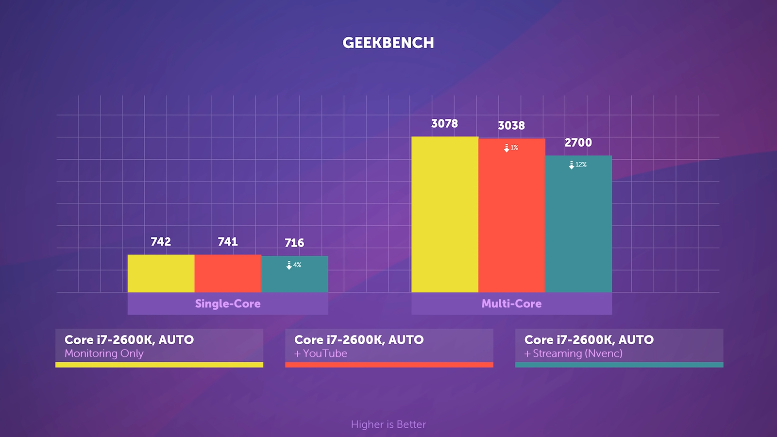 Более слабый i7-2600K показал результаты хуже остальных. В Cinebench во многоядерном режиме производительность снижалась у него на 3 процента с YouTube и на 16 процентов - с запущенным стримингом, в Geekbench - на 1 и 12 процентов соответственно. Что касается Adobe Premiere Pro, то он работал на 3 и 20 процентов медленнее (с YouTube и со стримингом).