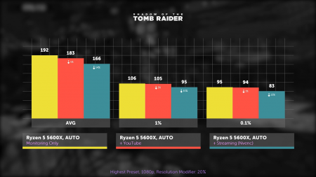 В Shadow of the Tomb Raider частота кадров ещё больше снизилась. При открытом браузере с YouTube средний FPS стал ниже на 5 процентов, с браузером и стримингом - на 14 процентов (192 к/с против 183 к/с и 166 к/с соответственно). В крайне редких событиях производительность опустилась на 1 и 13 процентов соответственно (95 к/с против 94 к/с и 83 к/с).