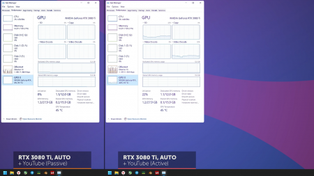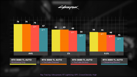 Проводилось также тестирование в Cyberpunk 2077 с упором на видеокарту. Оказалось, что на средний FPS запуск YouTube в пассивном режиме никак не влияет, воспроизведение видео снижает частоту кадров на 4 процента, а дополнительный стриминг - на 15 процентов. В очень редких событиях частота кадров при пассивном запуске YouTube уменьшилась на 2 процента, при активном использовании YouTube - на 14 процентов, при стриминге - на 27 процентов.