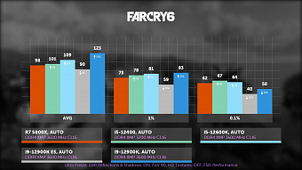 Far Cry 6 запускали с ультра-пресетом, включенными DXR-тенями и отражениями, отключенными HD-текстурами, FSR: Performance. Здесь результаты оказались примерно такими же, как в предыдущем случае. Также нагрузка на GPU у i9-12900K ES в процессе игры оказалась самой высокой: около 90 %. Связано это с урезанным PCI Express-слотом.