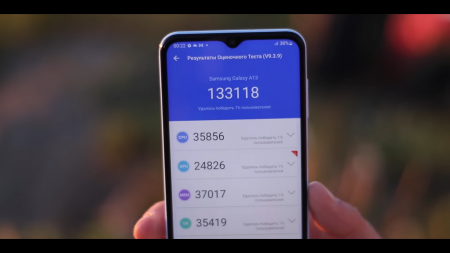 В AnTuTu набирает А13 133 тысячи баллов (результаты - ниже), и это мало. Работает смартфон на Android 12. А модель процессора, которая здесь стоит, - это Exynos 850.