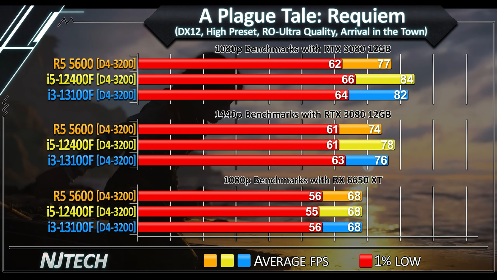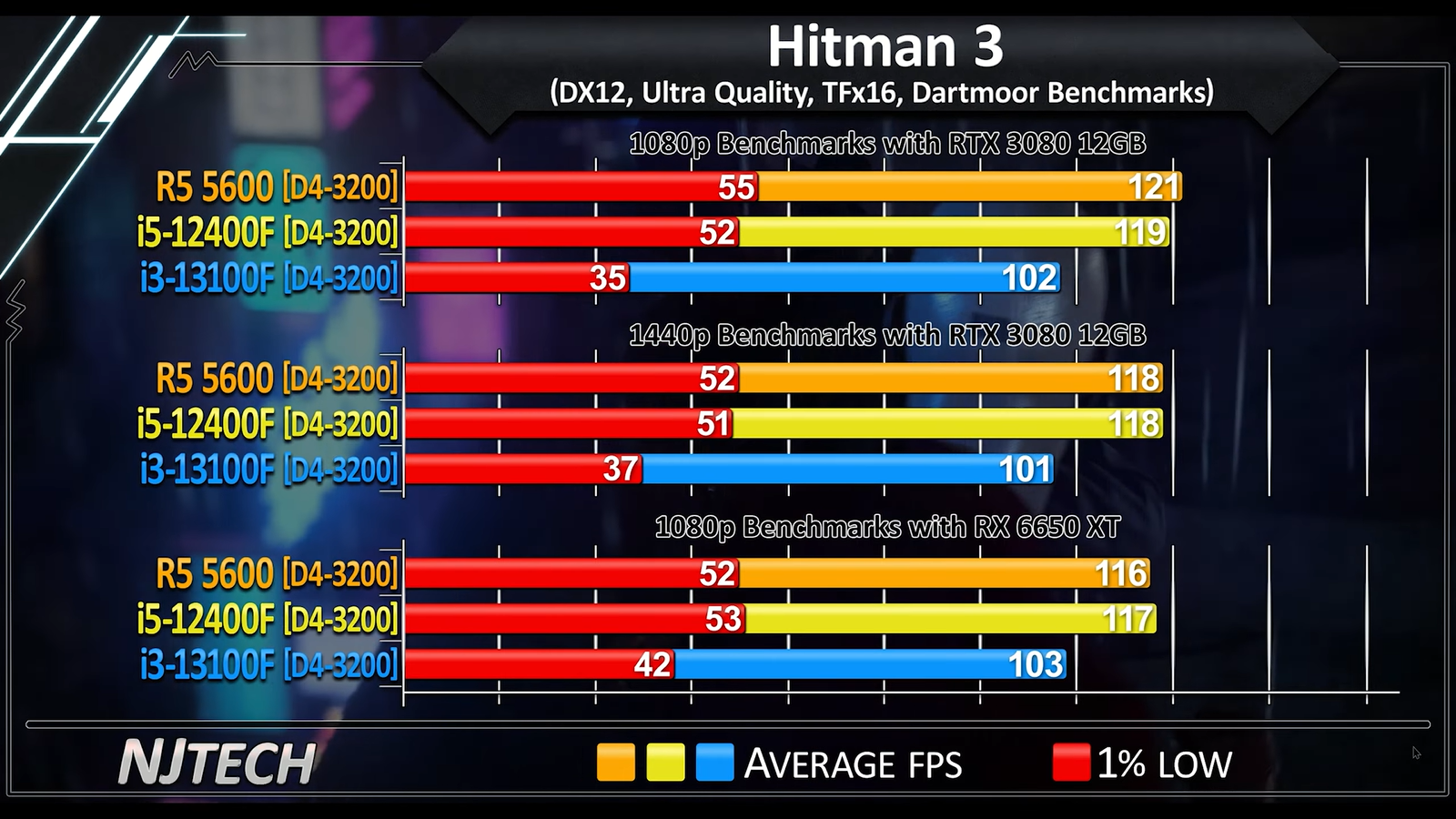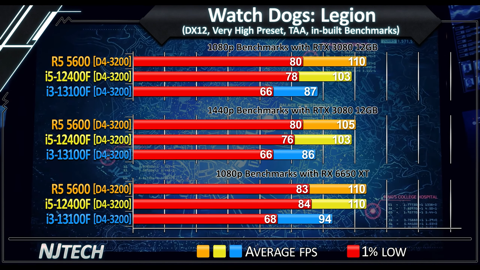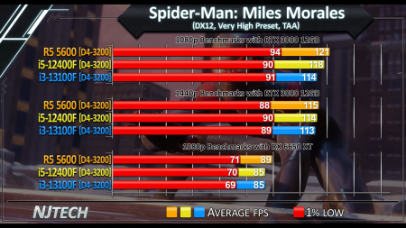 NJ Tech NJ Tech NJ Tech NJ Tech NJ Tech NJ Tech NJ Tech NJ Tech NJ Tech NJ Tech NJ TechВ играх тестировались процессоры в разрешении 1080p и 1440p. В Spider-Man: Remastered удалось получить при этом с DX12, Very High пресетом, TAA с RTX 3080 в 1080p - 121 к/с (R5 5600), 118 к/с (i5-12400F), 114 к/с (i3-13100F), в 1440p - 115 к/с, 114 к/с, 113 к/с соответственно. С RX 6650 XT показатели в 1080p составили 89 к/с, 85 к/с и 85 к/с соответственно.