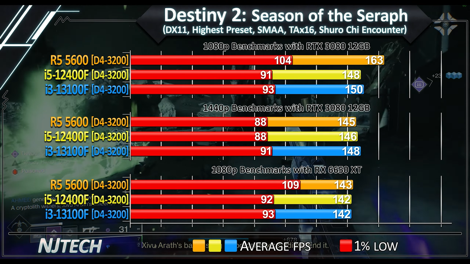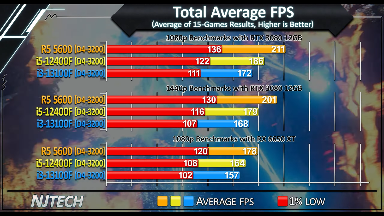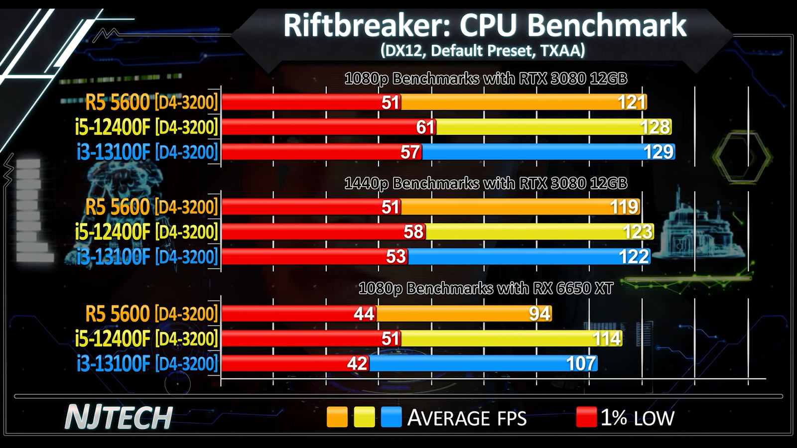 NJ Tech NJ Tech NJ Tech NJ Tech NJ Tech NJ Tech NJ Tech NJ Tech NJ Tech NJ Tech NJ TechВ играх тестировались процессоры в разрешении 1080p и 1440p. В Spider-Man: Remastered удалось получить при этом с DX12, Very High пресетом, TAA с RTX 3080 в 1080p - 121 к/с (R5 5600), 118 к/с (i5-12400F), 114 к/с (i3-13100F), в 1440p - 115 к/с, 114 к/с, 113 к/с соответственно. С RX 6650 XT показатели в 1080p составили 89 к/с, 85 к/с и 85 к/с соответственно.
