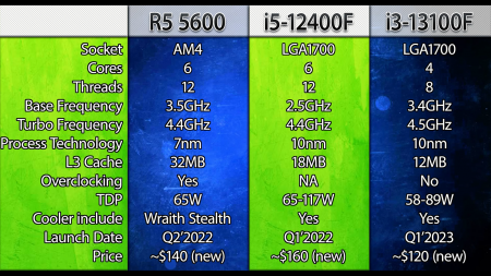 В одном из выпусков на YouTube-канале NJ Tech выяснили, какую производительность в играх и профессиональных программах смогут обеспечить процессоры Ryzen 5 5600, Intel Core i5-12400F, i3-13100F. Характеристики процессоров вы можете увидеть ниже.