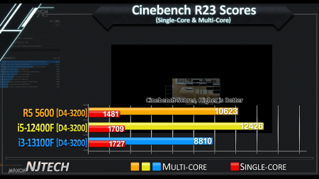 В Cinebench R23 во многопоточном режиме больше баллов было у i5-12400F, во однопоточном - у i3-13100F.
