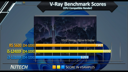 Результаты в V-Ray лучше остальных были у i5-12400F. Он оказался на 12% быстрее Ryzen 5 5600 и на 42% быстрее i3-13100F.
