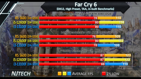 Far Cry 6 запускалась с DX12, пресетом High, TAA. С RTX 3080 12 ГБ в 1080p средняя частота кадров равнялась у R5 5600 - 110 к/с, у i5-12400F - 114 к/с, у i3-13100F - 110 к/с, в 1440p - 109 к/с, 113 к/с, 108 к/с. С видеокартой RX 6650 XT удалось получить в среднем 123 к/с, 122 к/с и 119 к/с соответственно.