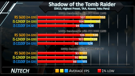 Shadow of the Tomb Raider шла с DX12, настройками графики Highest, TAA. С видеокартой RTX 3080 показатели производительности равнялись в разрешении 1080p 152 к/с (R5 5600), 141 к/с (i5-12400F), 126 к/с (i3-13100F), в 1440p - 136 к/с, 134 к/с, 124 к/с; с RX 6650 XT в среднем частота кадров находилась на уровне 111 к/с во всех случаях.