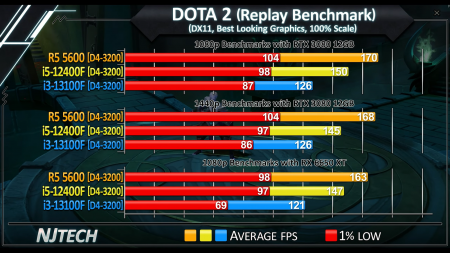 Dota 2 запускалась с DX11, графикой Best Looking, 100% Scale. С видеокартой RTX 3080 в этой игре удалось получить в 1080p - 170 к/с (R5 5600), 150 к/с (i5-12400F), 126 к/с (i3-13100F), в 1440p - 168 к/с, 145 к/с, 126 к/с соответственно. С RX 6650 XT эти значения составили 163 к/с, 147 к/с, 121 к/с.