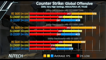 В игре CS:GO с DX9, настройками Very High, MSAA/FSAA Off, TFx16. В разрешении 1080p с RTX 3080 средняя частота кадров равнялась 574 к/с (с R5 5600), 452 к/с (с i5-12400F), 434 к/с (i3-13100F), в разрешении 1440p - 571, 450, 433 к/с. С RX 6650 XT показатели средней производительности равнялись 480 к/с, 364 к/с, 374 к/с.