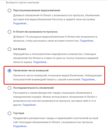 Последующим шагом следует выбор подтипа кампании. Выбор подтипа влияет на то, какие форматы видеообъявлений и стратегии будут доступны. Выяснить подробнее про знаменитые форматы можнож в данной статье. Ежели главная цель – перевод аудитории на сайт и привлечение конверсий, то избирать необходимо непосредственно этот подтип.