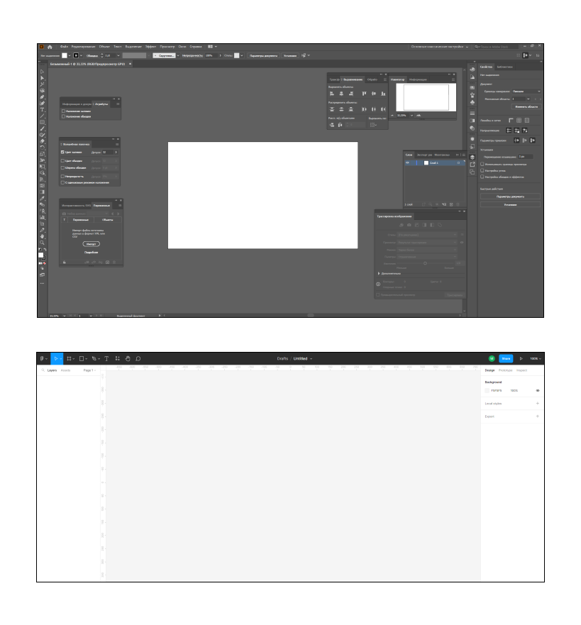 Сопоставление интерфейсов Adobe Illustrator (вверху) и Figma (внизу)
