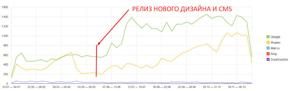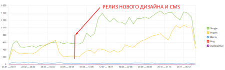 Динамика поискового трафика опосля релиза новейшего дизайна с доработанными КФ и переносе на фреймворк