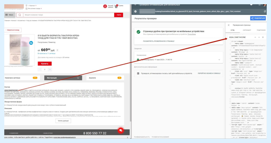 Когда мы стали отыскивать контент в HTML-коде, который получает бот, узрели, что текстового описания не было. Потому продукт никак не мог ранжироваться – у бота нет инфы: ни наименования продукта, ни состава, ни аннотации.